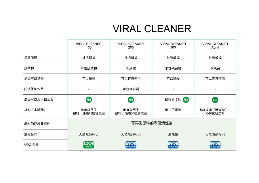 产品编号: A01055VIRAL CLEANER 300 清洗剂能起到清洗和除油的作用,使表面清新、干净卫生。由于病毒(如新冠病毒)的外包膜是一层脂膜,含表面活性剂的 VIRAL CLEANER 300 在能够满足清洗效果的同时,还能把病毒的脂膜溶解掉,使病毒失去活性,导致其失去传染性。